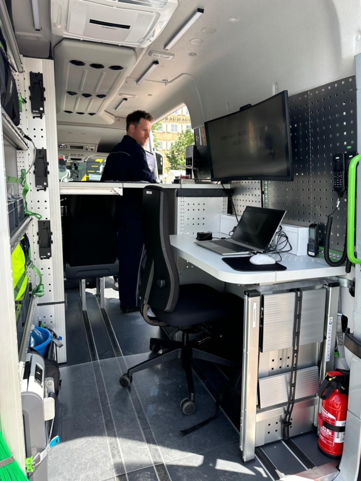 Das speziell ausgebaute Polizeifahrzeug vom Typ MAN TGE 3.180 ist mit modernsten technischen Finessen bestückt, die es den Beamten ermöglichen, ihre polizeilichen Aufgaben flexibel und ortsunabhängig zu erfüllen. So ist das Fahrzeug mit einem Laptop, W-LAN, einem Drucker, Steckdosen und zahlreichen Funkgeräten sowie Zugang zu Polizeidatenbanken ausgestattet. Der Batteriespeicher ermöglicht einen autarken Betrieb für mindestens vier Stunden. Darüber hinaus kann das Fahrzeug über eine Außeneinspeisung auch jederzeit an das Stromnetz angeschlossen werden. Die Temperatur im Inneren lässt sich mit einer Klimaanlage und einer Standheizung unkompliziert regulieren. An heißen Tagen schützt eine ausfahrbare Markise vor Sonneneinstrahlung. Mit der Ausstattung können die Polizisten alltägliche Tätigkeiten, die für gewöhnlich in einer Polizeiwache anfallen – wie etwa Kontrollen, Sachbearbeitung oder Fahndungsmaßnahmen – fortan mobil ausführen.